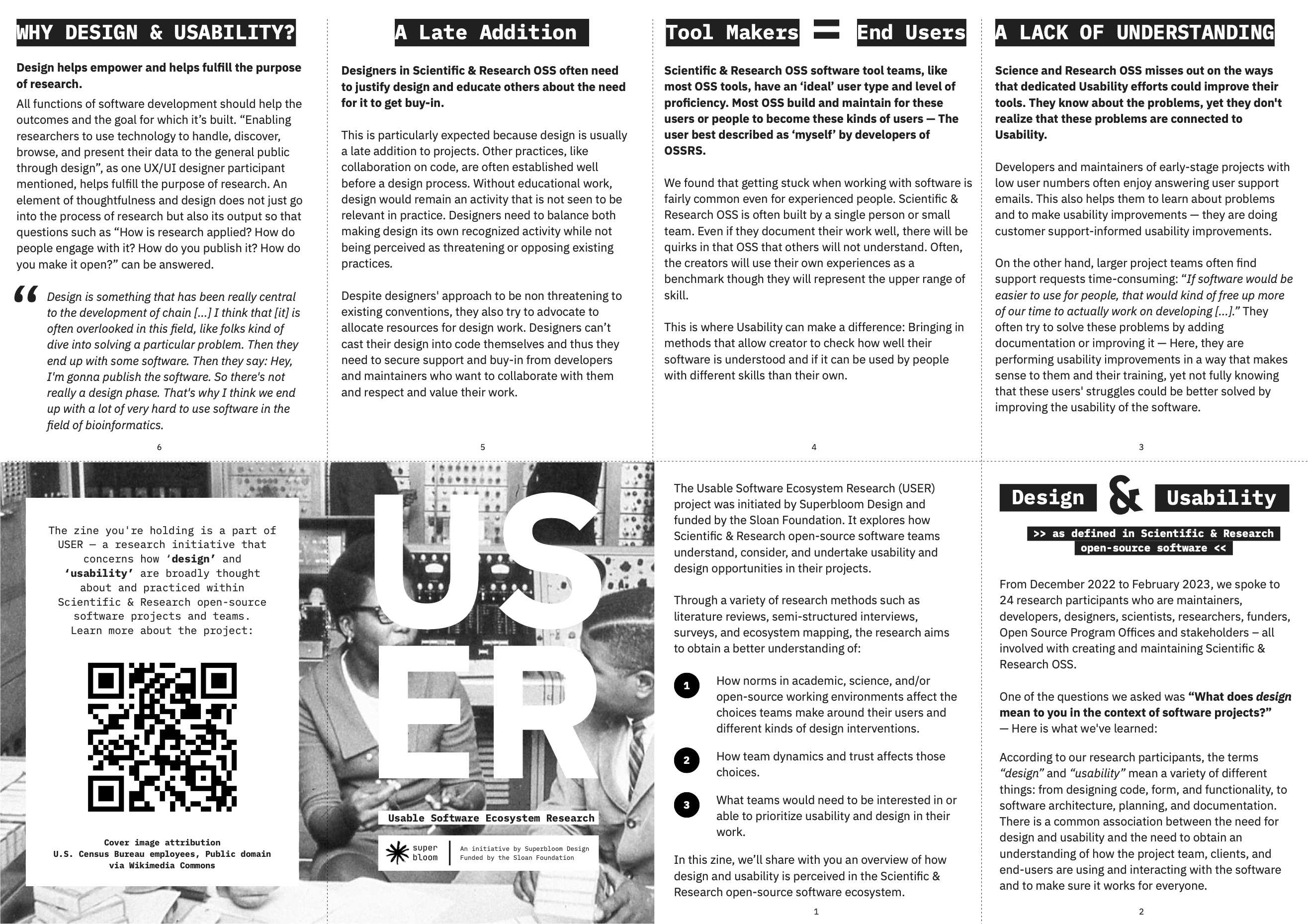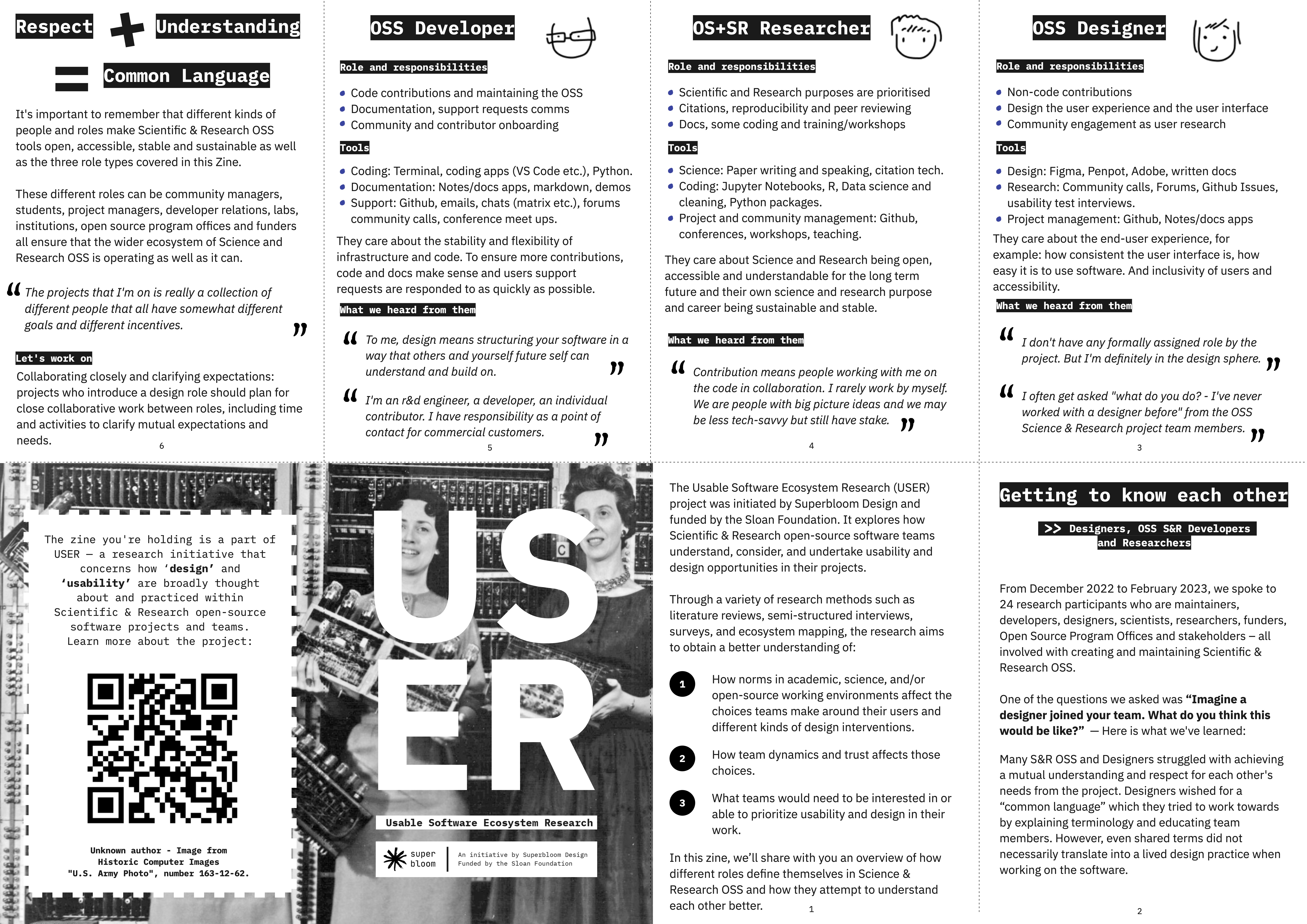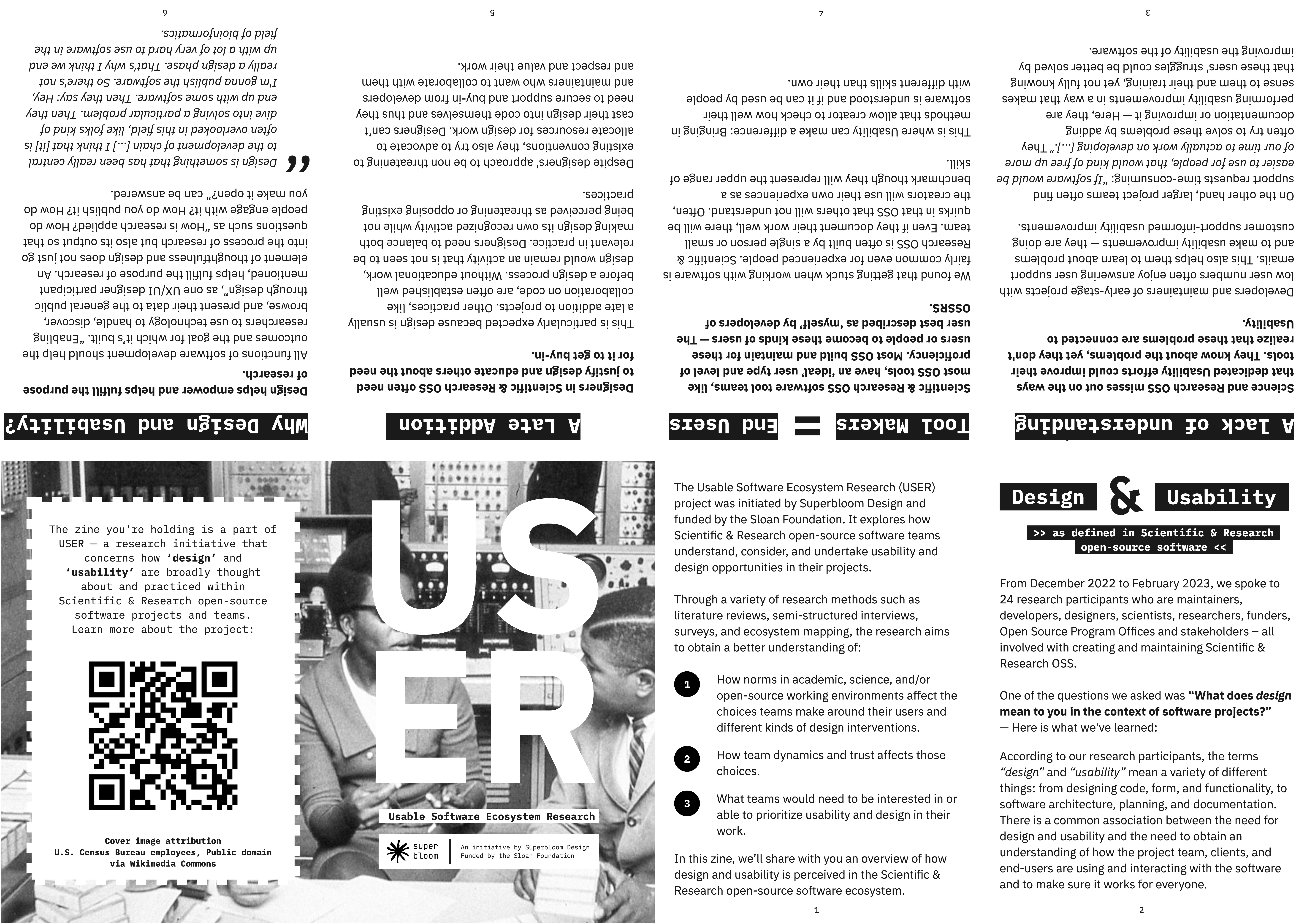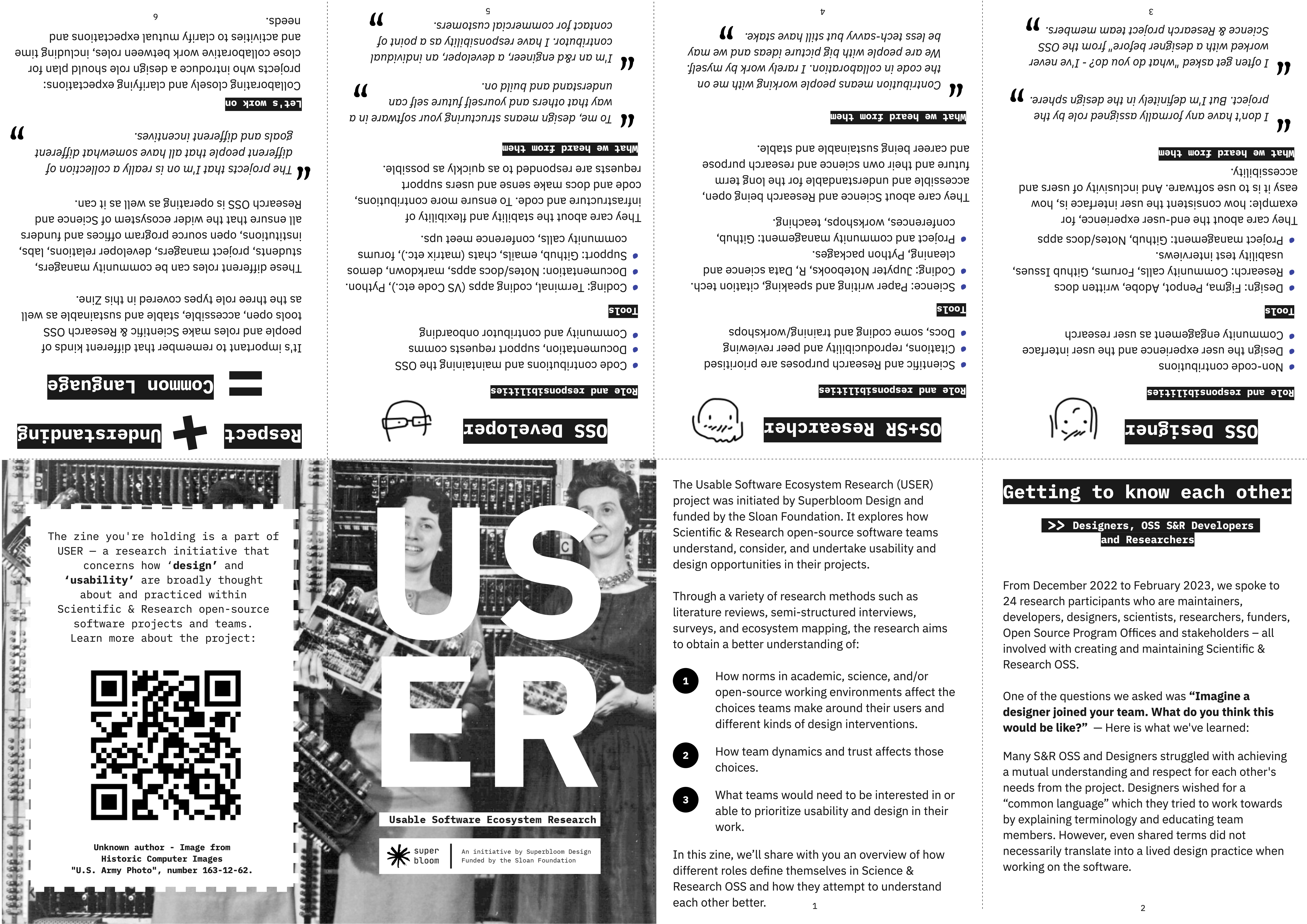 In an effort to package keys findings from our research into more digestible and distributible pieces, we created zines. We used the zine format as a way to introduce people to our research and findings at conferences, and hope to continue to distribute them to raise awareness and pique interest about design and usability in science and research OSS.